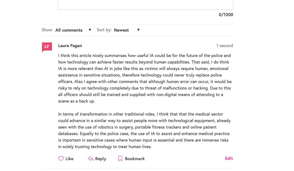The encouragement to comment on the MOOC pushed me to consider my own opinion about this article and the use of IA in the police instead of passively reading about the topic. I found that taking other user’s ideas into account offered further depth to my learning and allowed me to consolidate my ideas, in this case with previous comments on treating technology with caution.