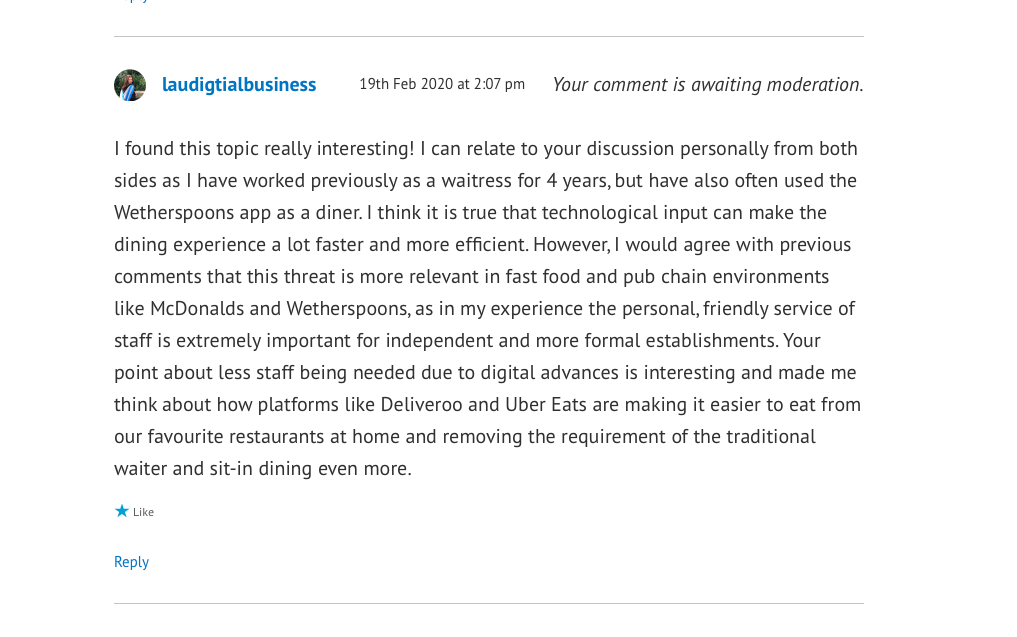 The Digital Hunt’s Blog : https://digitalhunt.home.blog/2020/02/13/restaurants-and-robots/
